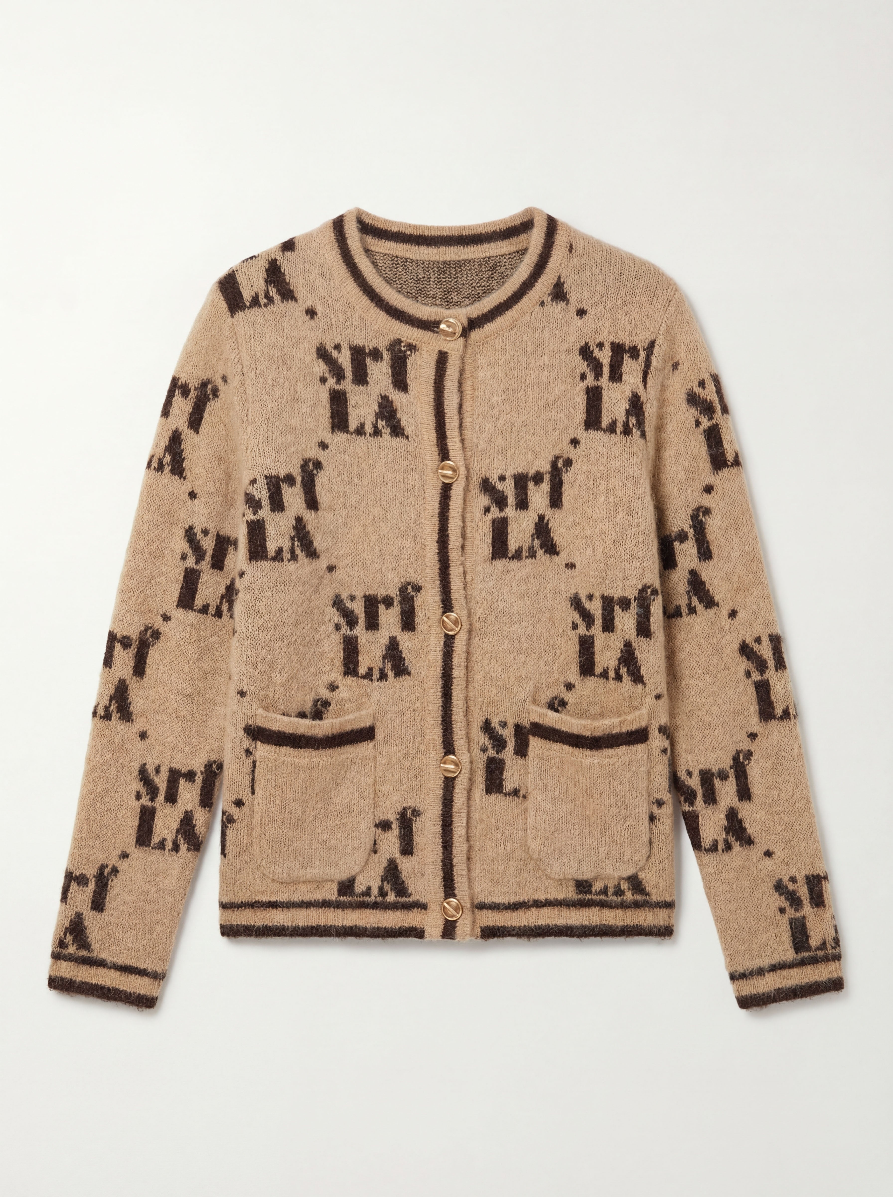 A modern take on a classic knit, the SRF Cardigan is fitted with slim sleeves and a cropped shape that flatters on its own or layers effortlessly. Crafted in a soft mohair wool blend and finished with our 70’s Argyle SRF LA logo, it carries a touch of California nostalgia with everyday wearability.
