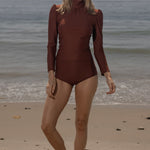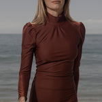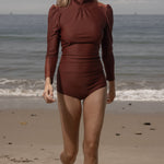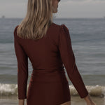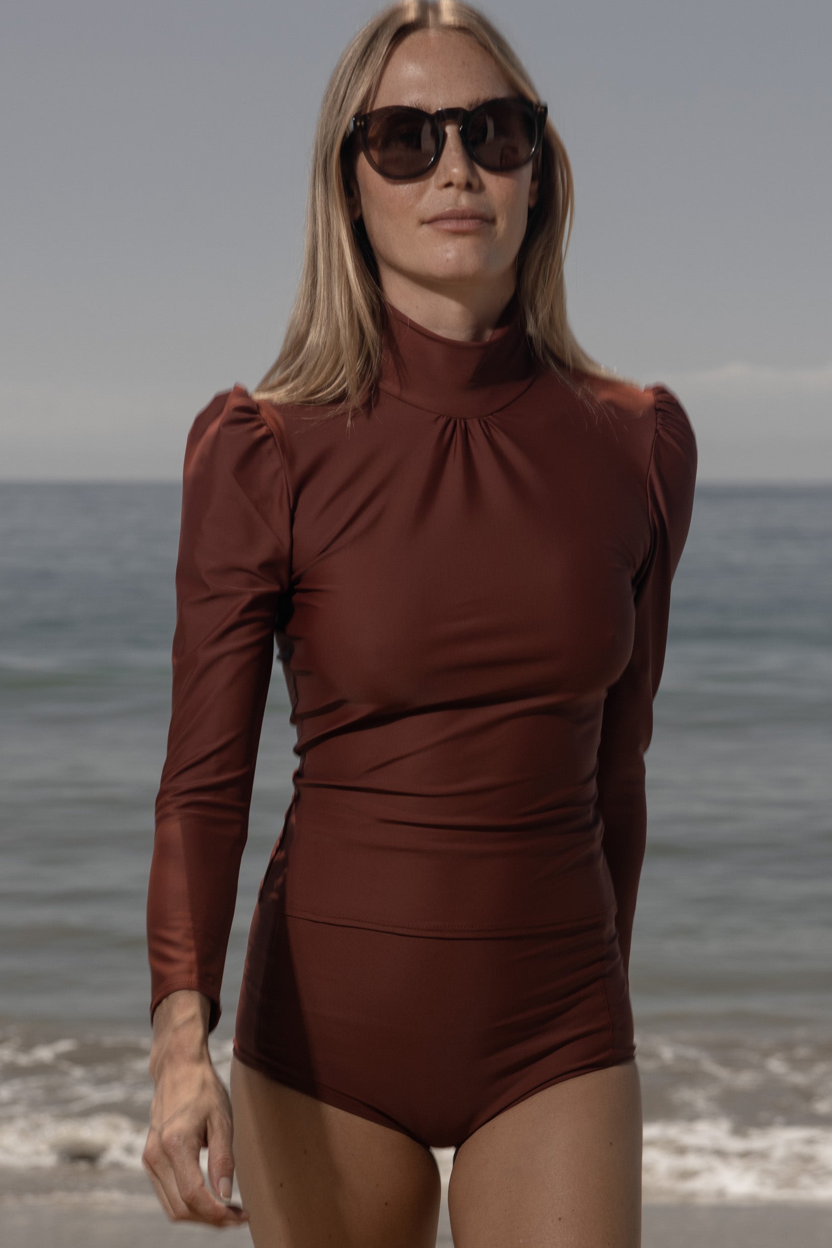 The Heidi Merrick Swim Collection is defined by elevated, practical silhouettes with just the right amount of coverage. The Izzy embodies this balance, offering sun protection with a refined, feminine touch. Designed with a puffed sleeve and gathered shoulder detail, its 3/4 length sleeves and mock collar create a chic, athletic profile. The full-length torso ensures a flattering fit whether worn in the water or styled beyond the beach.