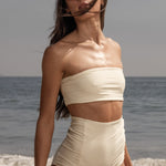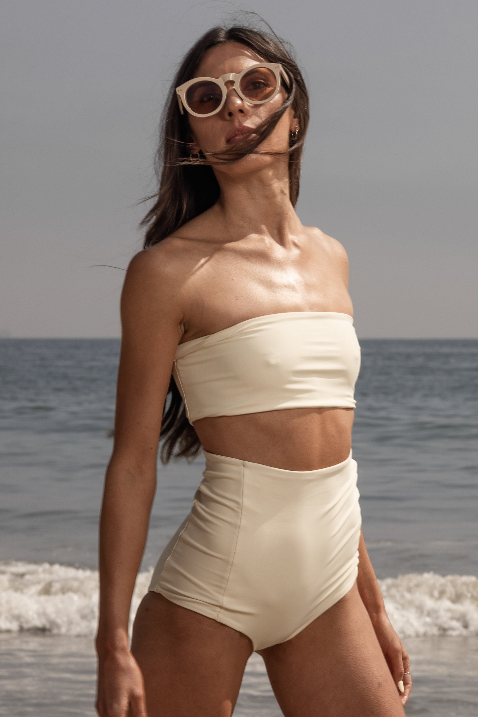 The VICENT bikini is composed of a luxe Nylon-Spandex Tricot. The pull over bandeaux features elastic at the hems. Lined in self fabric for ultimate comfort.
