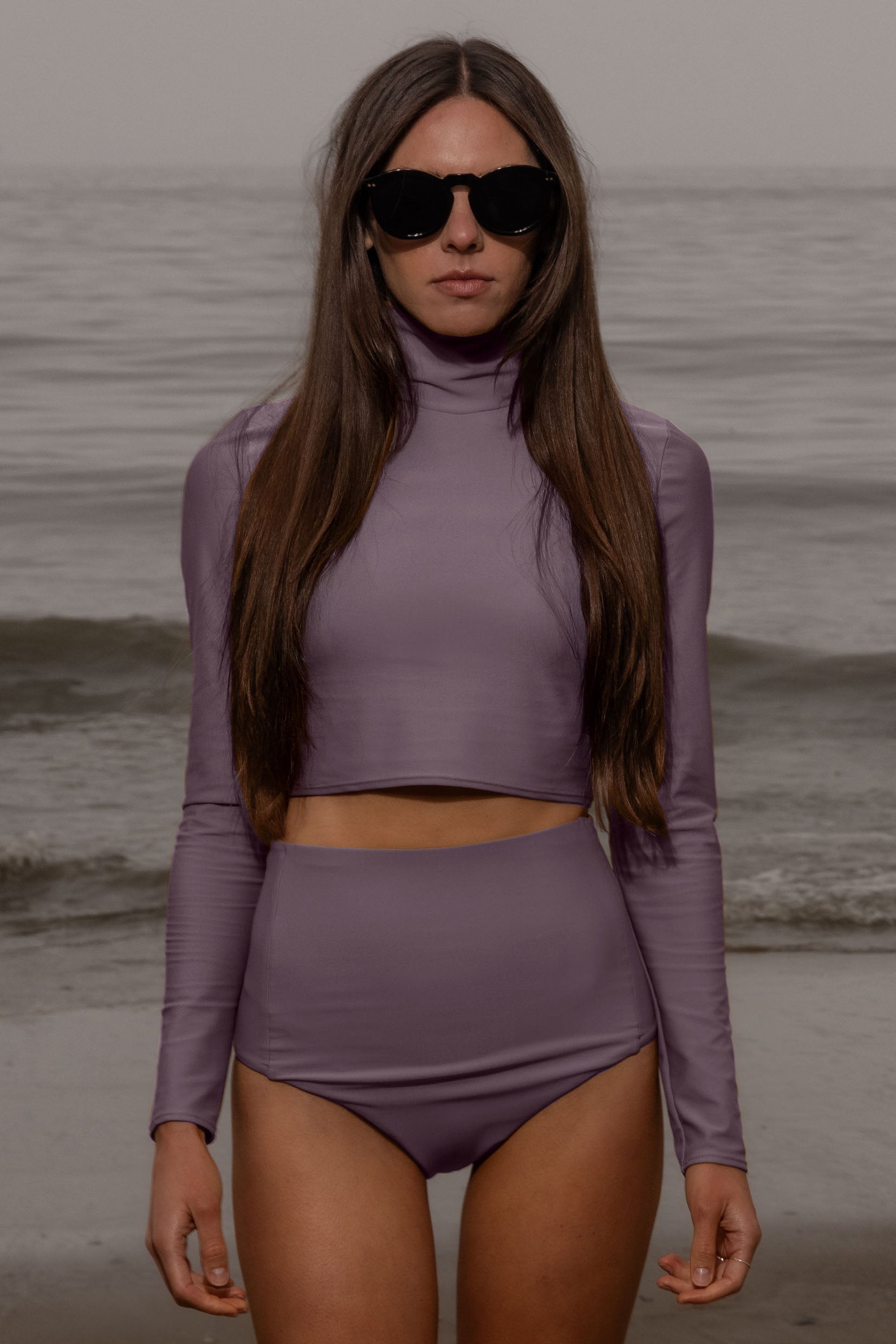 Cropped just above the belly button with a straight, full-length sleeve and clean funnel collar, this piece blends performance with refinement, whether you're paddling out or styling it poolside.